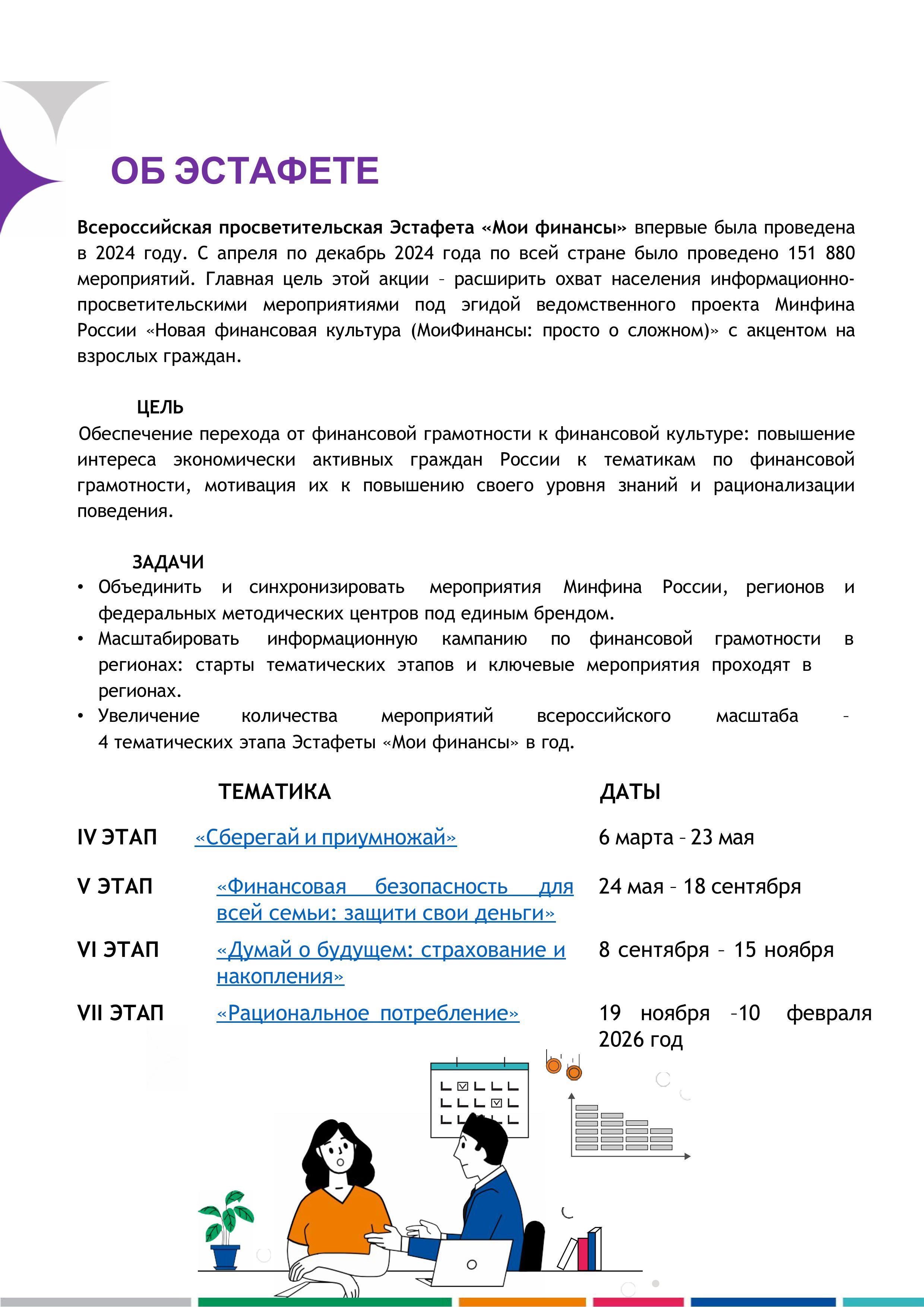 С целью обеспечения перехода от финансовой грамотности к финансовой культуре: повышение интереса экономически активных граждан России к тематикам по финансовой грамотности, мотивация их к повышению своего уровня знаний и рационализации поведения в нашем регионе проходит VII этап «Всероссийской просветительской эстафеты «Мои финансы» "Рациональное потребление".